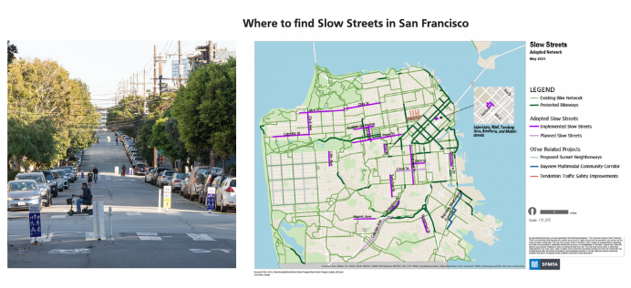 During COVID, San Francisco city government launched the Slow Street Program to help maintain social distance requirements for users on the streets. Slow Streets utilize temporary tools like cones and signage to divert traffic and remind vehicles to maintain a safe speed to accommodate for pedestrians and bicyclists who may be traveling to make essential trips. After COVID, this program continued as part of a connected, citywide Active Transportation Network, designed to eliminate deaths and severe injuries related to transportation, and encourage more people to choose low-carbon ways to travel for their daily trips.